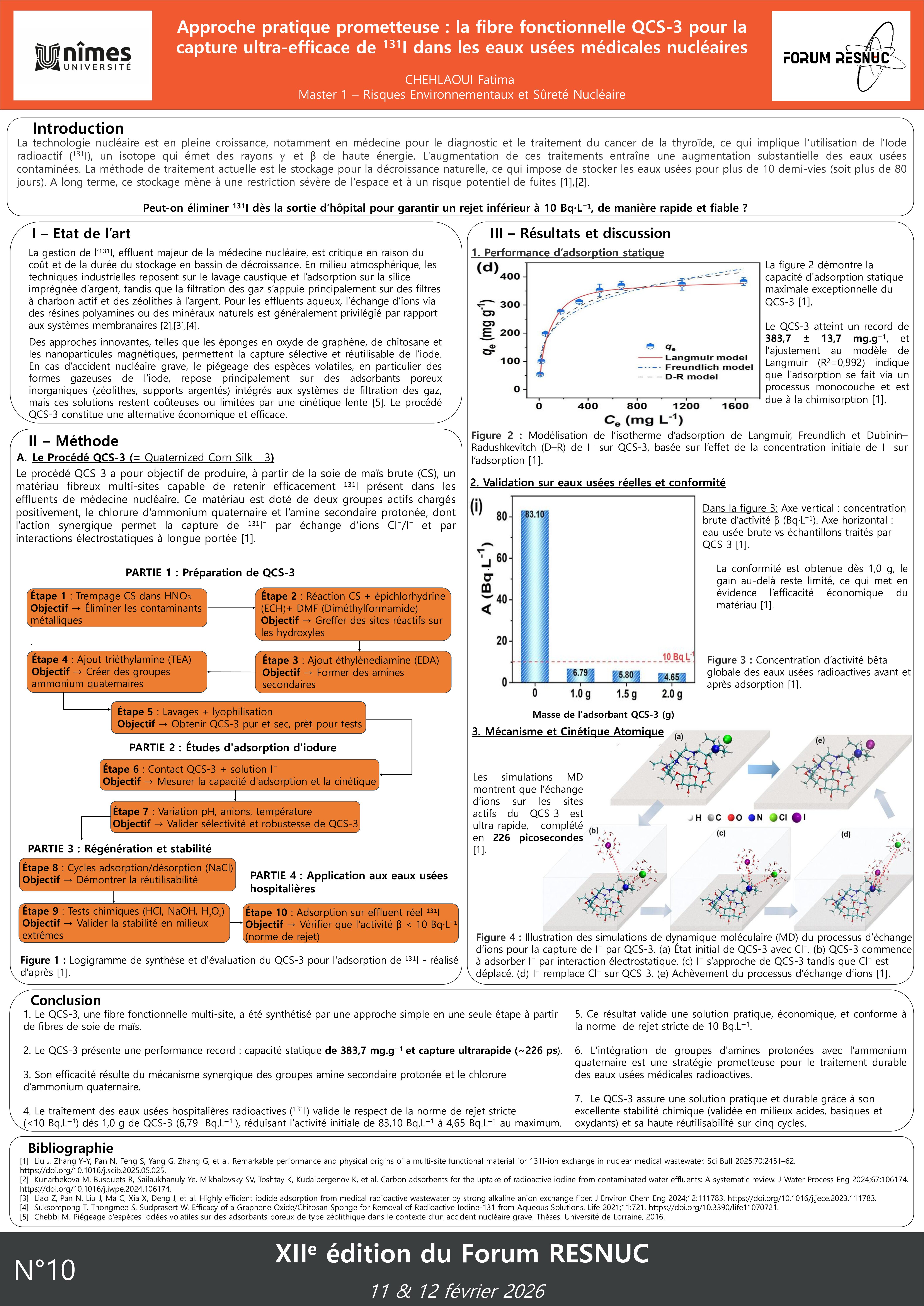 10 – Approche pratique prometteuse : la fibre fonctionnelle QCS-3 pour la capture ultra-efficace de 131I dans les eaux usées médicales nucléaires.29 January 2026 in Posters 2026 Poster n°10 - CHEHLAOUI Fatima Share on Facebook Share on Twitter