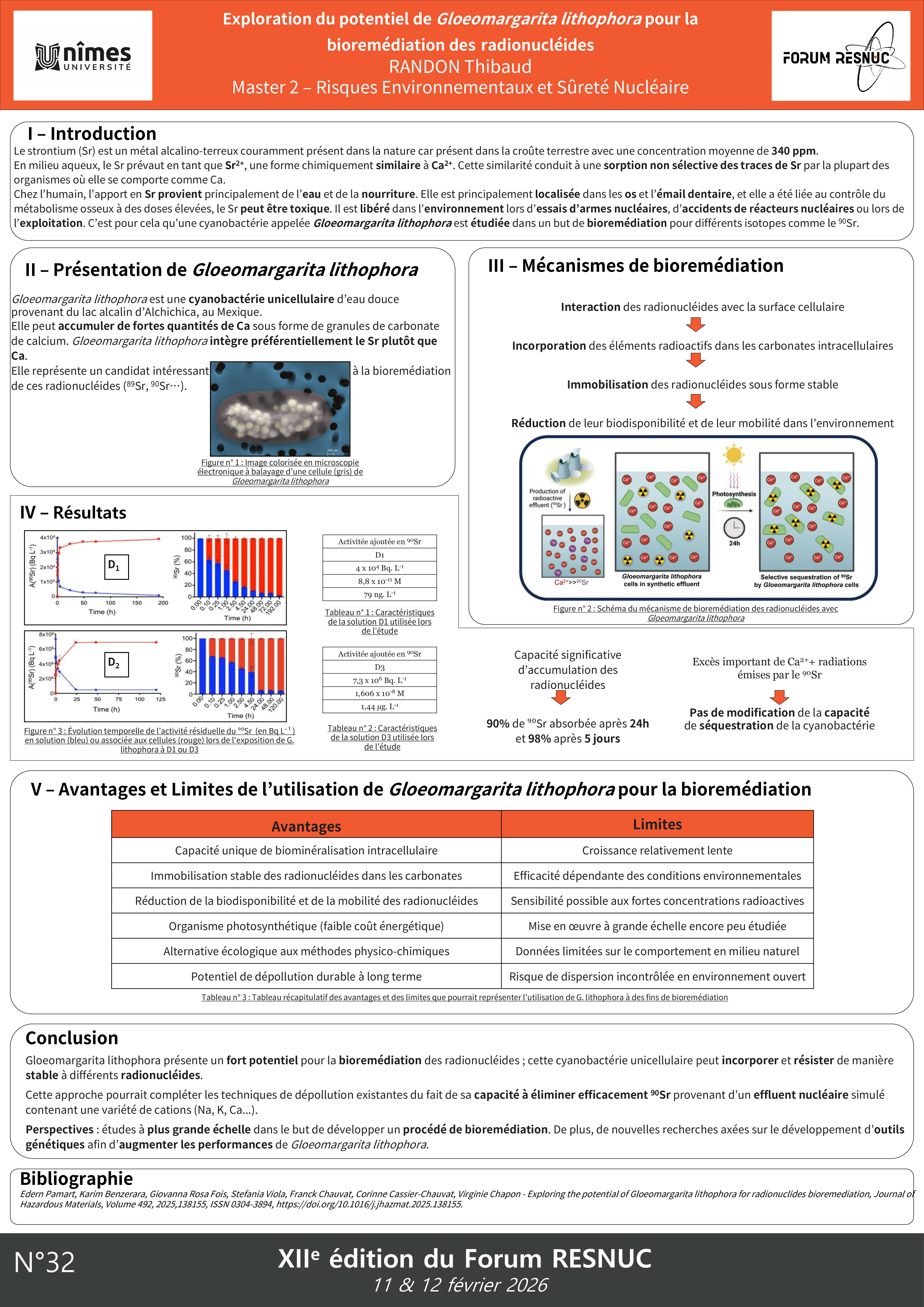 32 – Exploration du potentiel de Gloeomargarita lithophora pour la bioremédiation des radionucléides.29 January 2026 in Posters 2026 Poster n°32 - RANDON Thibaud Share on Facebook Share on Twitter